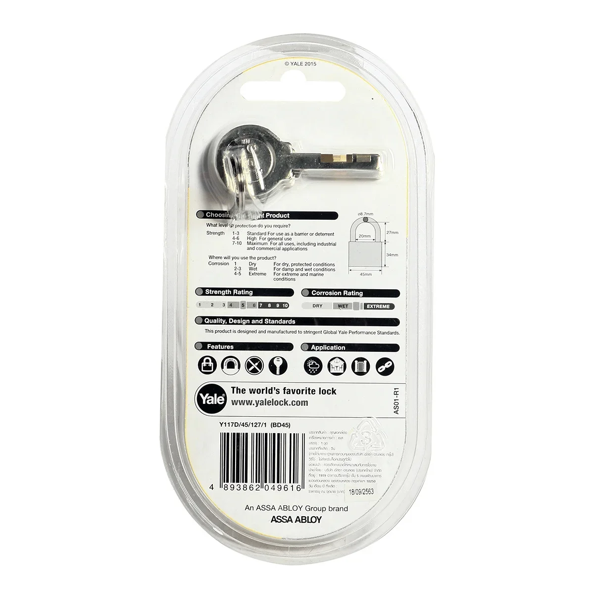 คุณสมบัติ กุญแจคอสั้น 45มม.YALE รุ่น BD45
